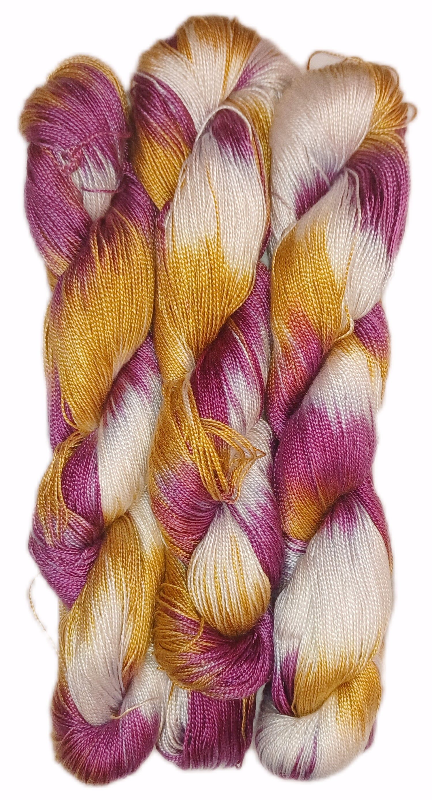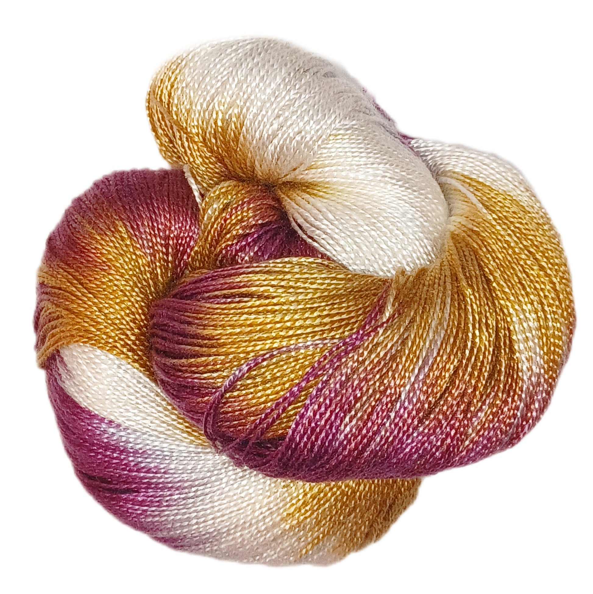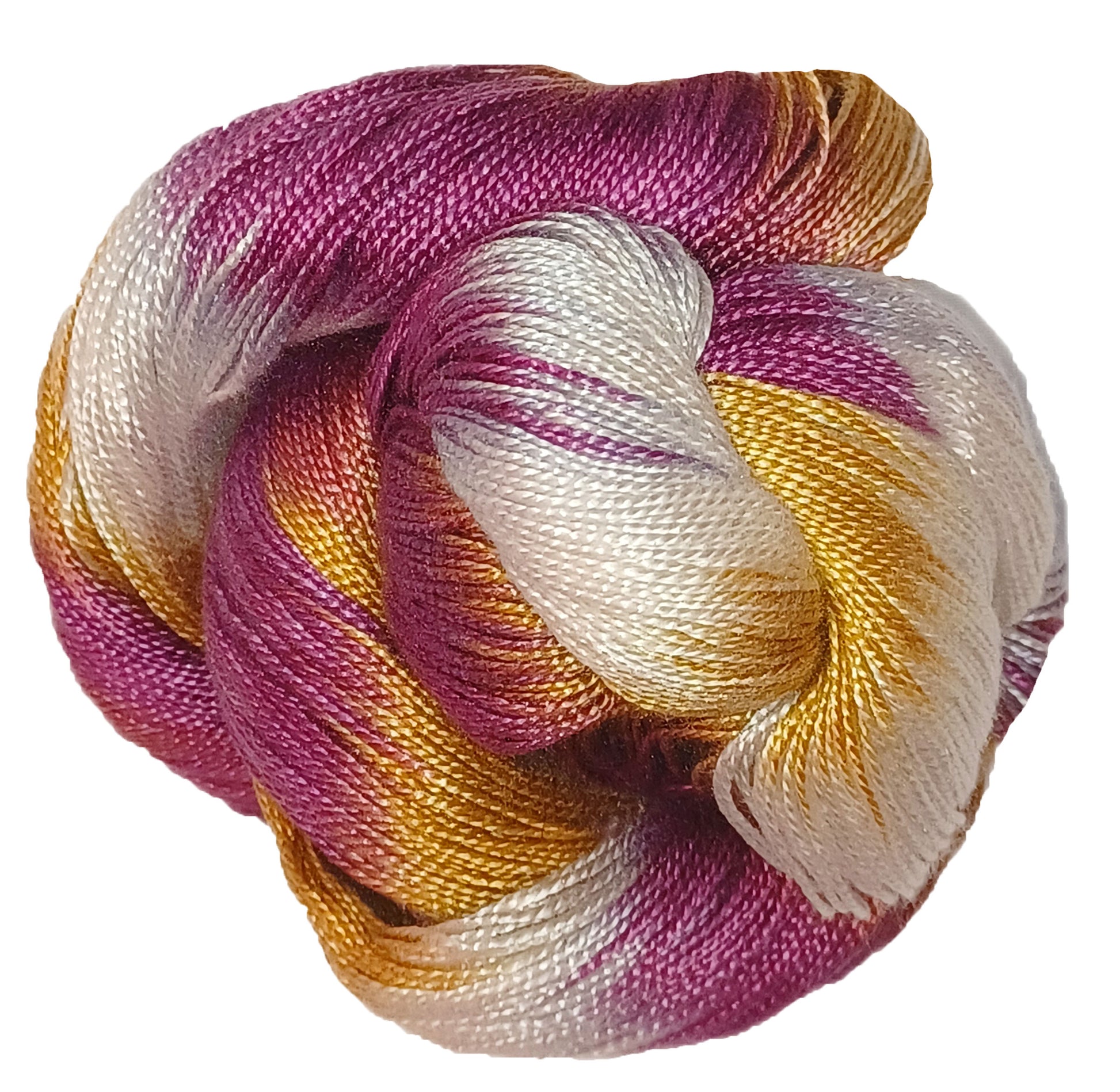 Dryad 100% Tencel is very shiny, super smooth, light, and hand painted yarn made from wood pulp cellulose. This man-made fiber is a fantastic alternative to wool, for knitting, crocheting, or weaving. Of course, it can be used for any number of fun crafts. Its use is only limited by your imagination! The above 4 ounce skein of 100% hand painted tencel is more than enough yarn for a weaving project or fantastic for lace knitting. Since these items are hand-painted, they are limited edition. Grab them while you can to tuck safely into your yarn stash! Sunny yellow and beautiful, rich red mingle with a pure white in this exciting blend of colors. Gauge: Needle size US00-0 = 7+ stitches per inch Care: Hand wash cool, dry flat. Measures: 4 oz; 545 yards Weight: Lace Dyed by: Liz