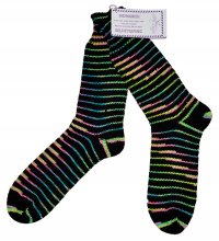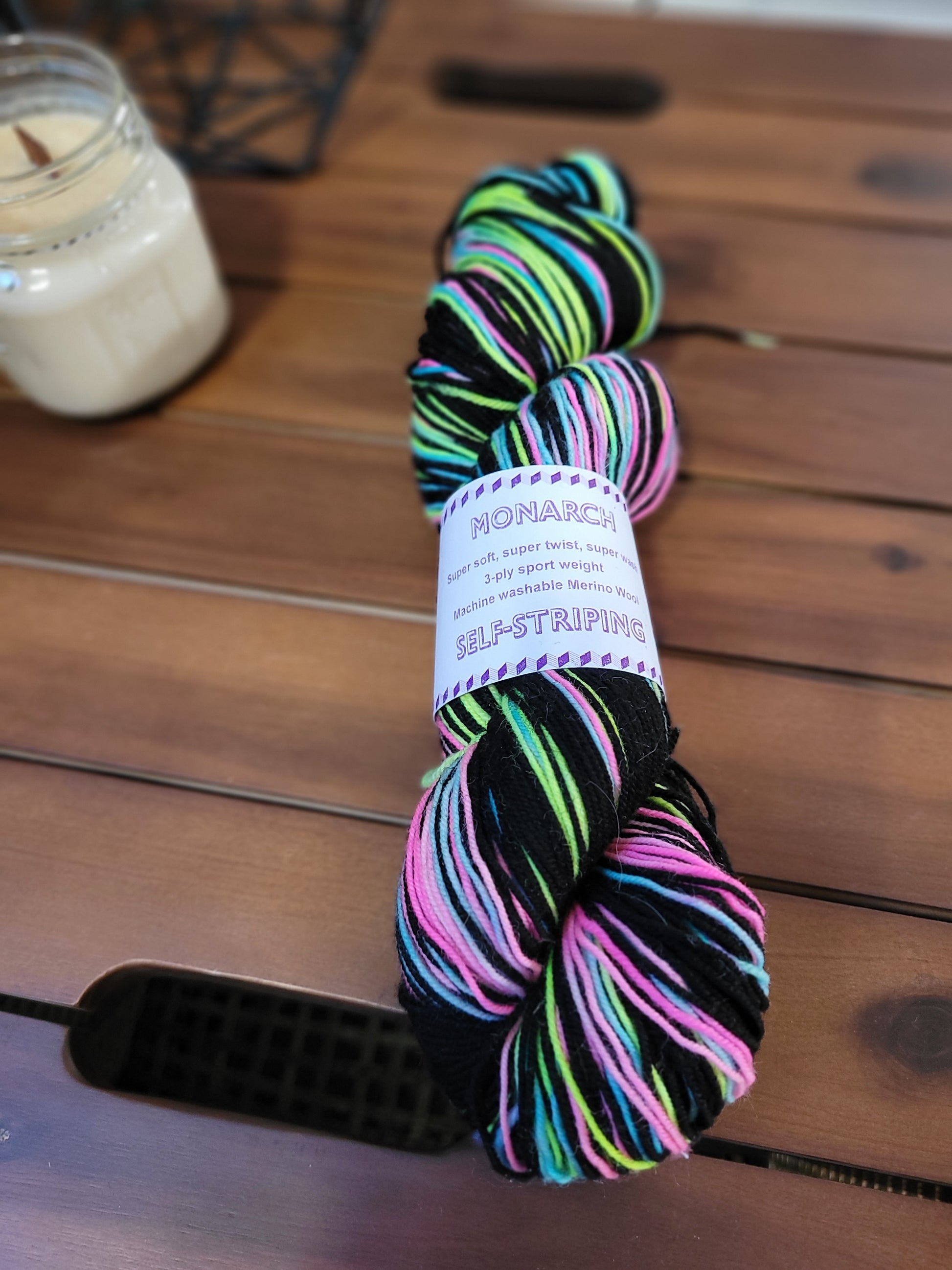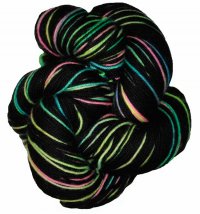 Fly*Dyed Monarch yarn is super soft, super twist, super wash merino wool. As shown in the example photograph, this yarn is self-striping when it is knit into a pair of socks! Comes in a skein.